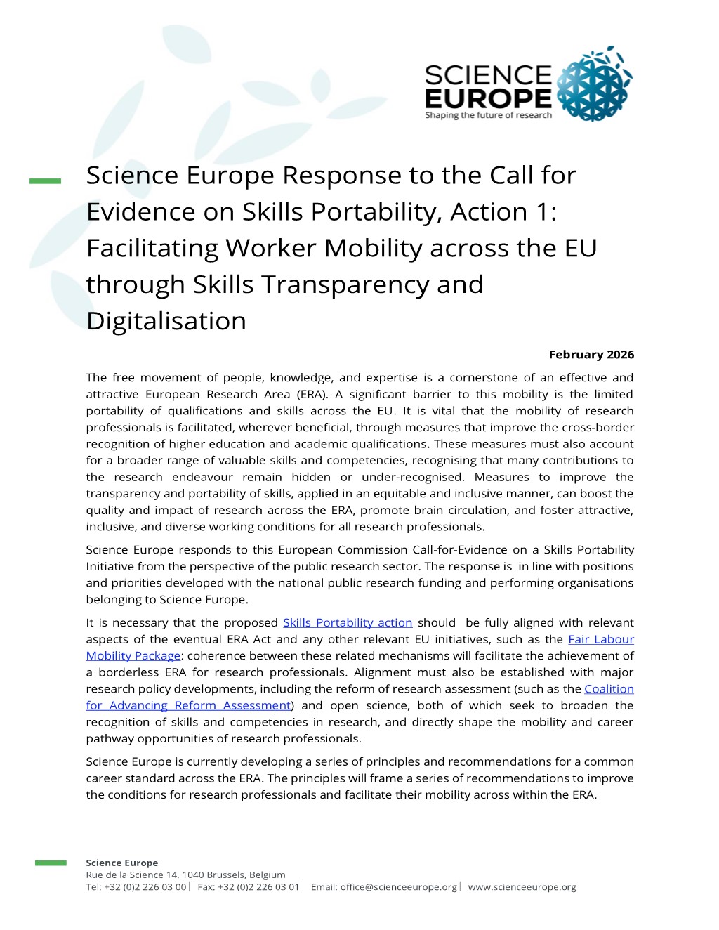 Science Europe has responded to the European Commission Call-for-Evidence on a Fair Labour Mobility Package, emphasising that equitable and inclusive career and mobility opportunities for research professionals are central to the effectiveness, attractiveness, and quality of the European Research Area. The response builds on Science Europe’s long-standing commitment to improving research careers and mobility, as reflected in its previous policy positions and activities on careers and working conditions in research.